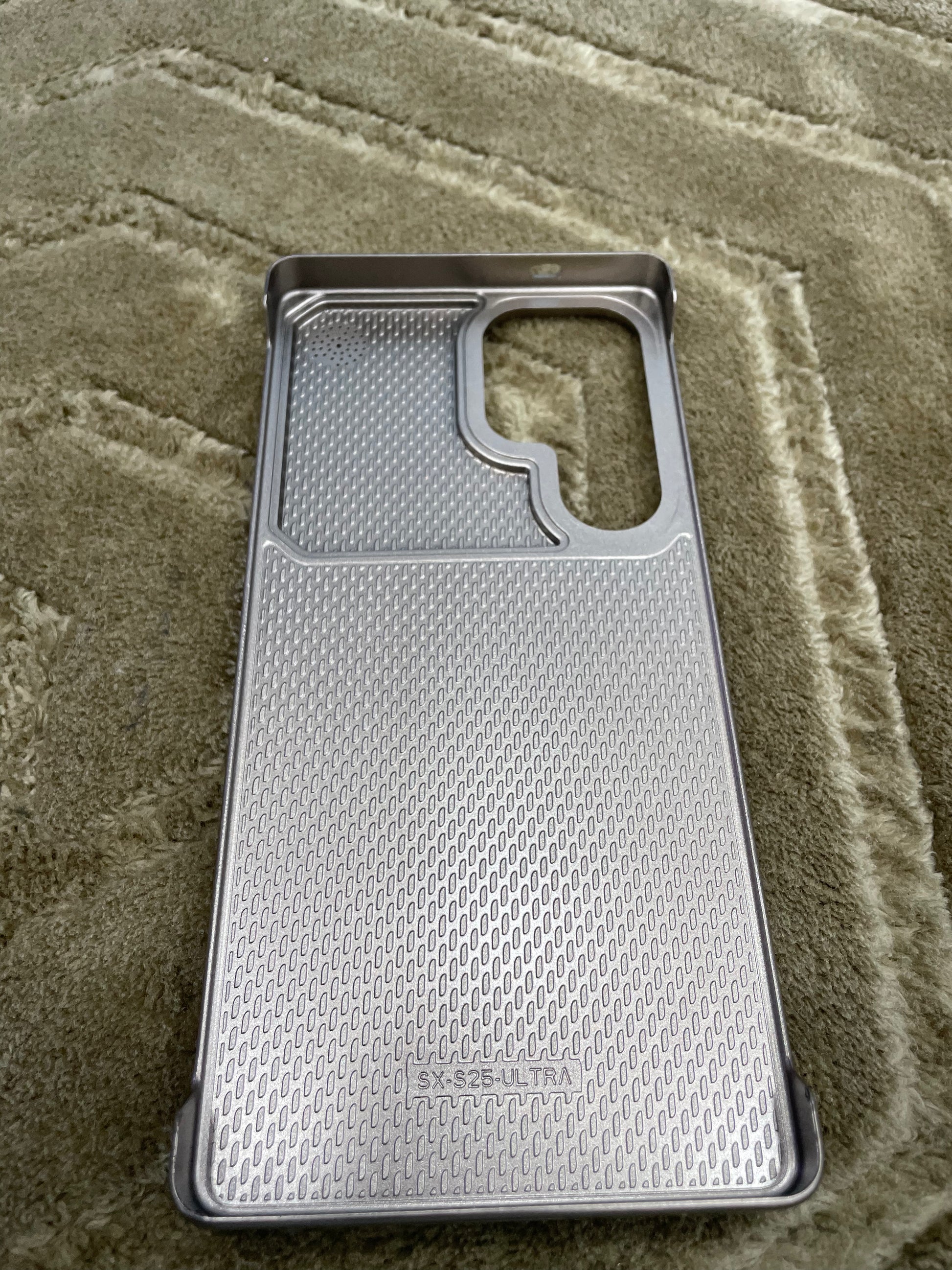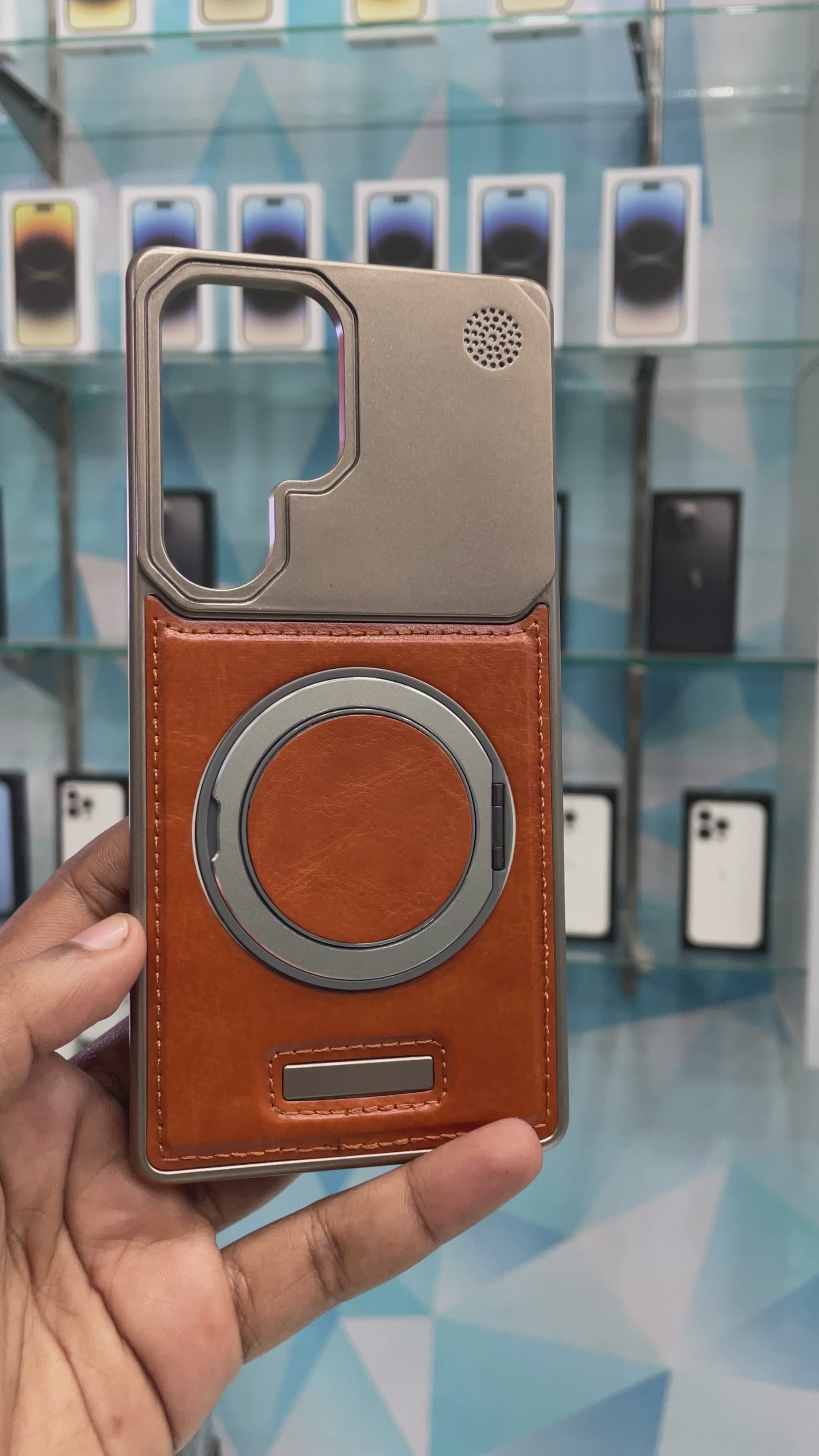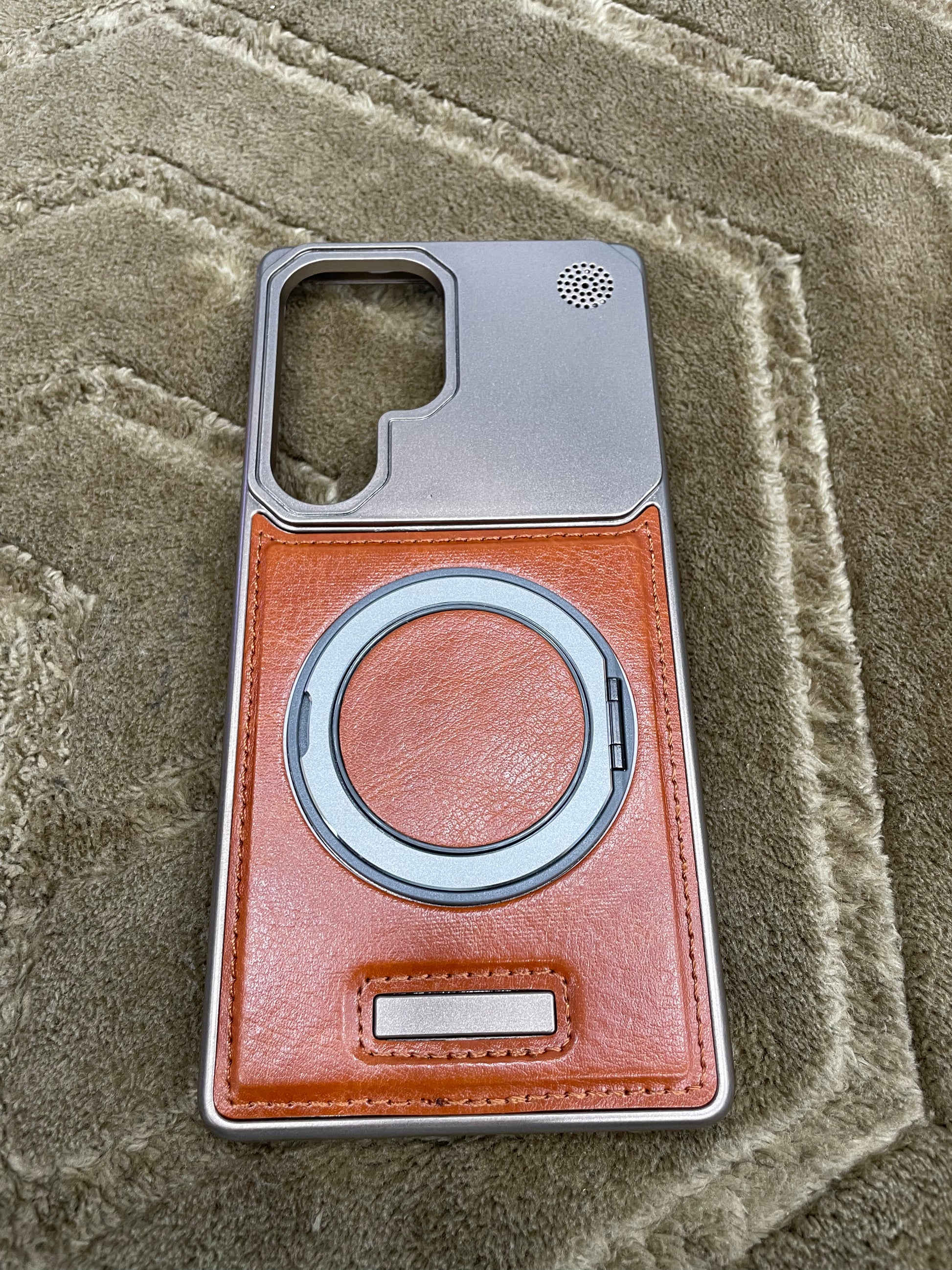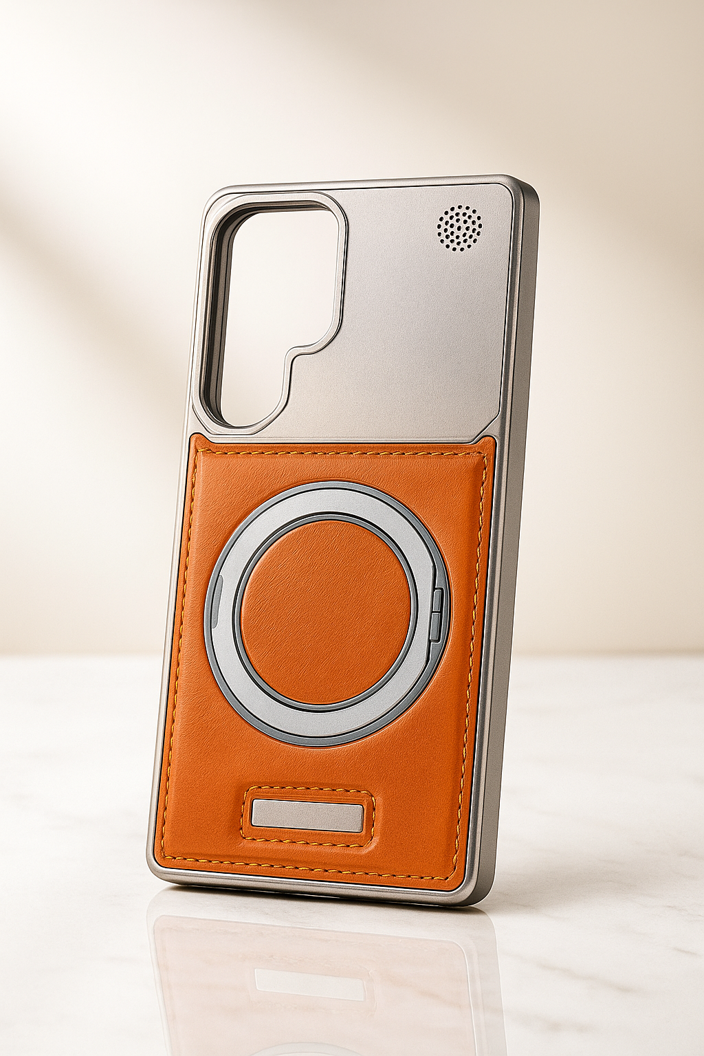 Premium protective cover for Samsung Galaxy S25 Ultra. Crafted with a sleek metallic frame and elegant orange leather finish for a stylish, durable, and comfortable grip.